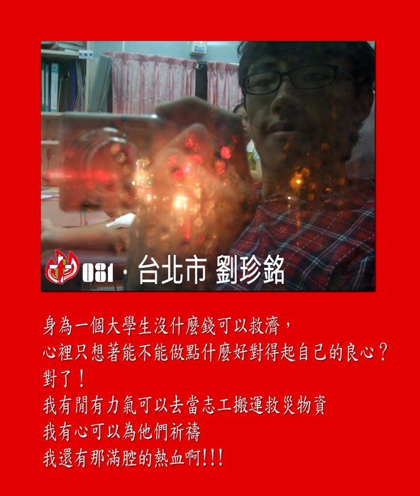 「我們以任何型式來努力救災,不光是為了災民,也是為了自已。我們大部份的人不是英雄,也許幫不上很多忙。但現在不去做,我們怕以後有很長的一段時間,都會活在愧疚中,都要拯救自已心裏更嚴重的災情。」