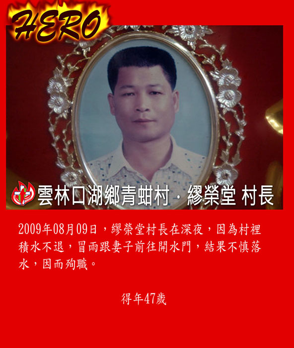 我也沒有辦法告訴繆榮堂生前拼了最後一絲力氣推上岸的妻子葉玲雅,我們的公共工程和防災救險已經盡到一切的努力,所以感謝你今天為了村民犧牲,保全了更多人的性命。