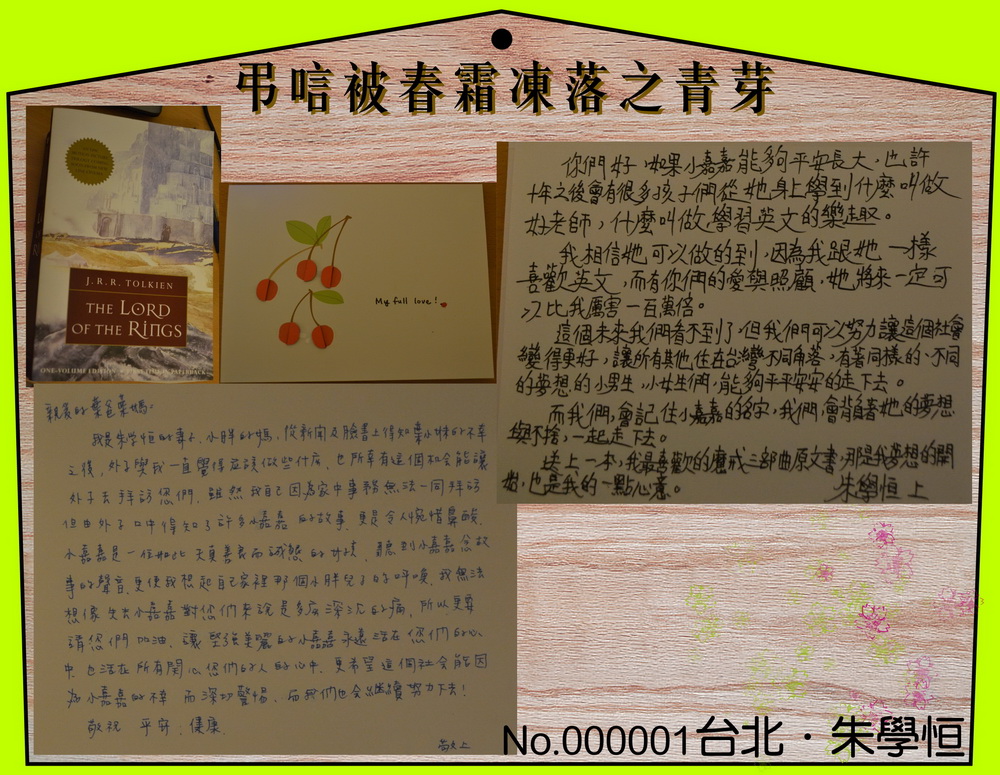 我也相信她將來會變成一個很好很好的英文老師,也會讓更多和她一樣的小男生、小女生愛上文學、愛上閱讀。