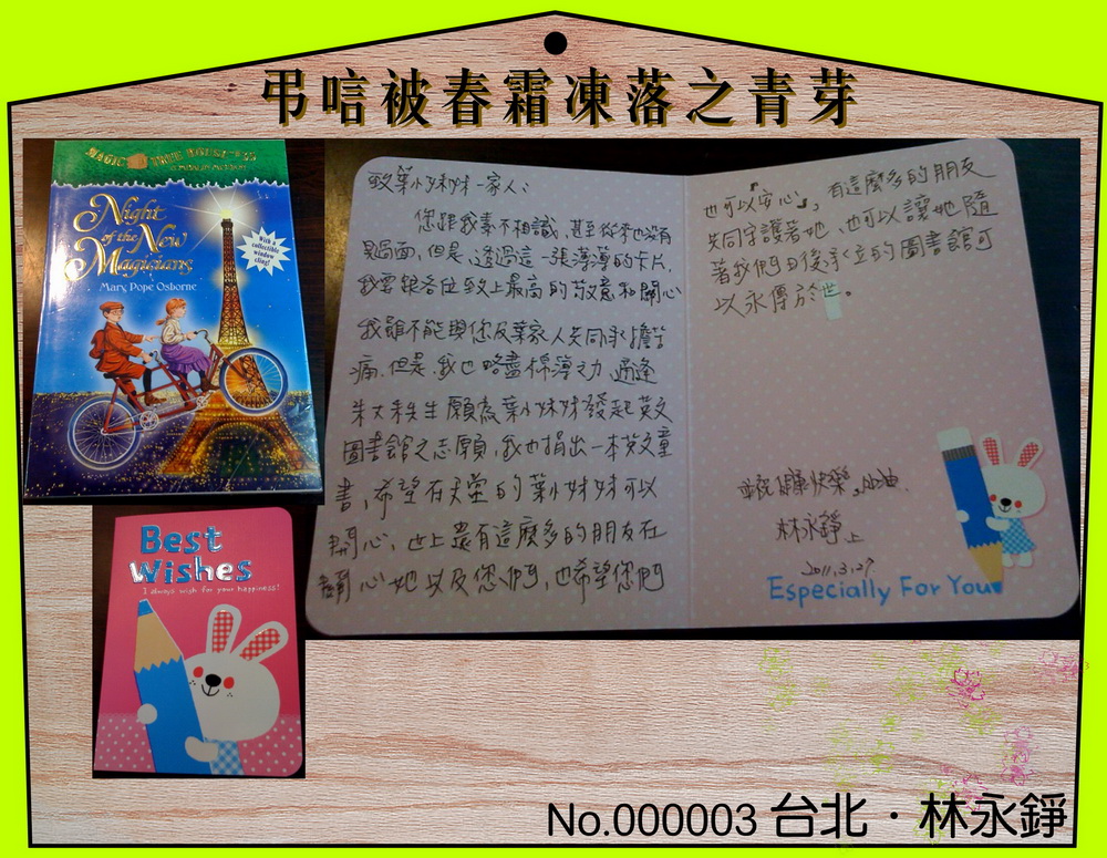 第四、請你把卡片的封面和內頁和要捐的那本書拍照之後,寄到 skyvensen@gmail.com (記得要說一下你是從哪裡寄出卡片唷~~~,像我就是台北~~~)