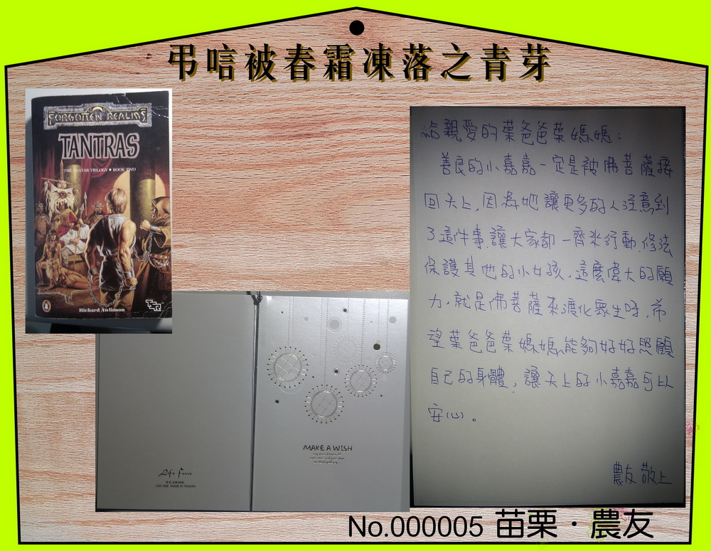 第二、寄本英文書到上面同樣的地址去,讓雲林莿桐鄉未來的小弟弟、小妹妹可以在自己家的附近借到、看到于嘉最喜歡的原文書,再也不需要離家走遠!
